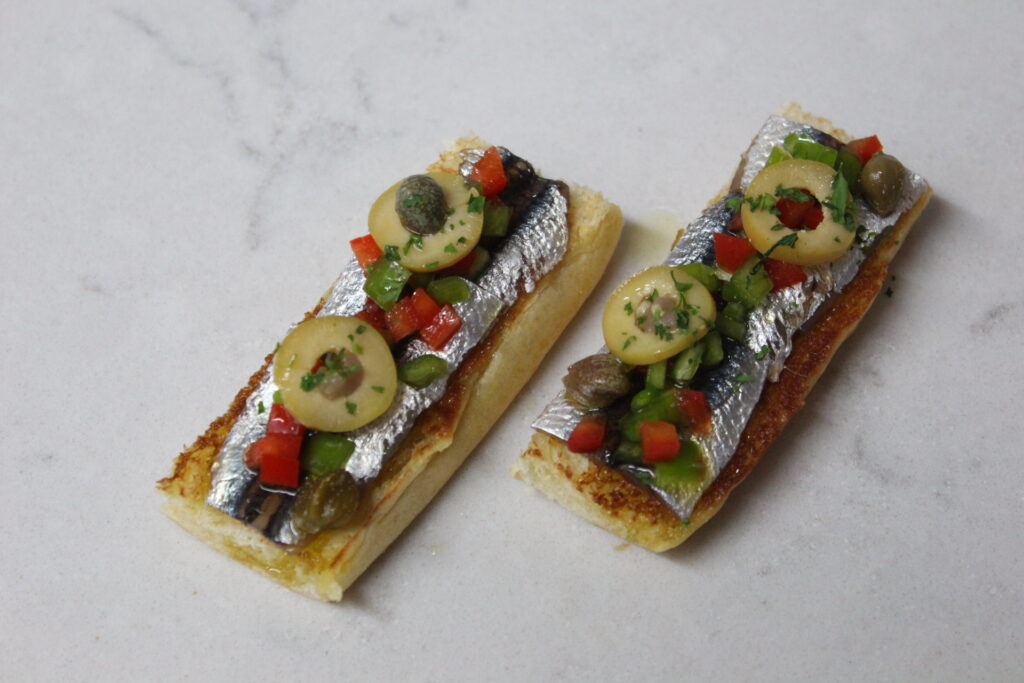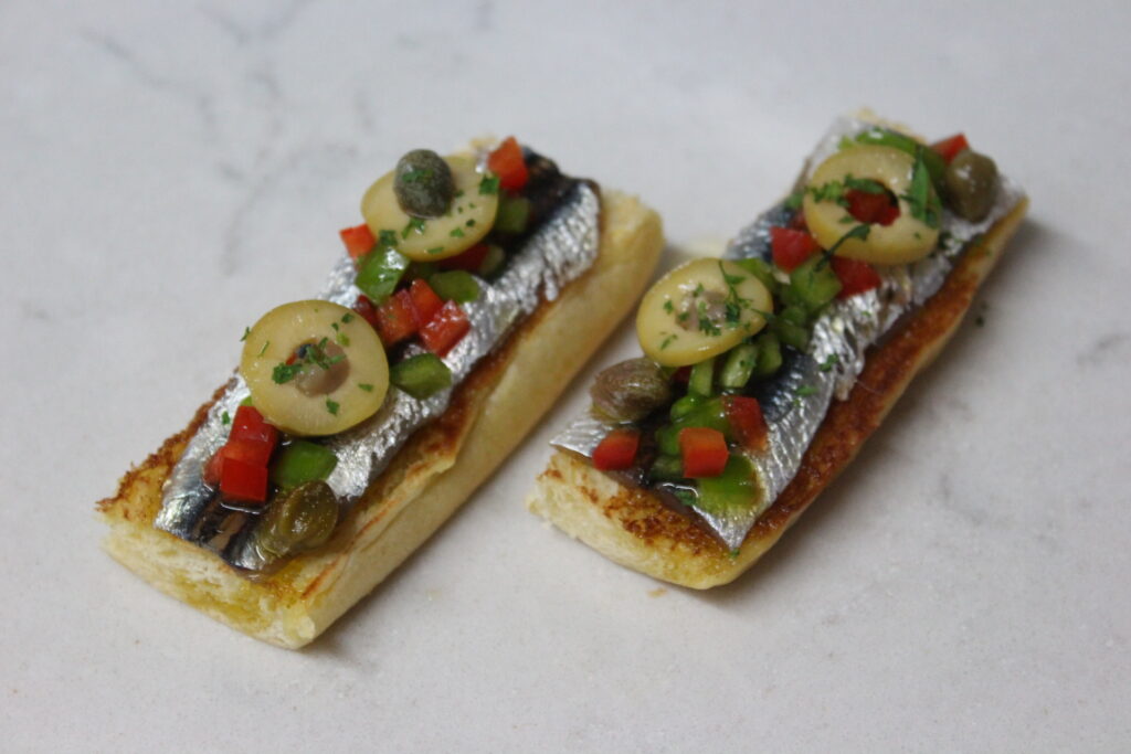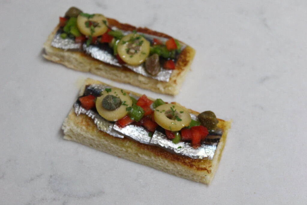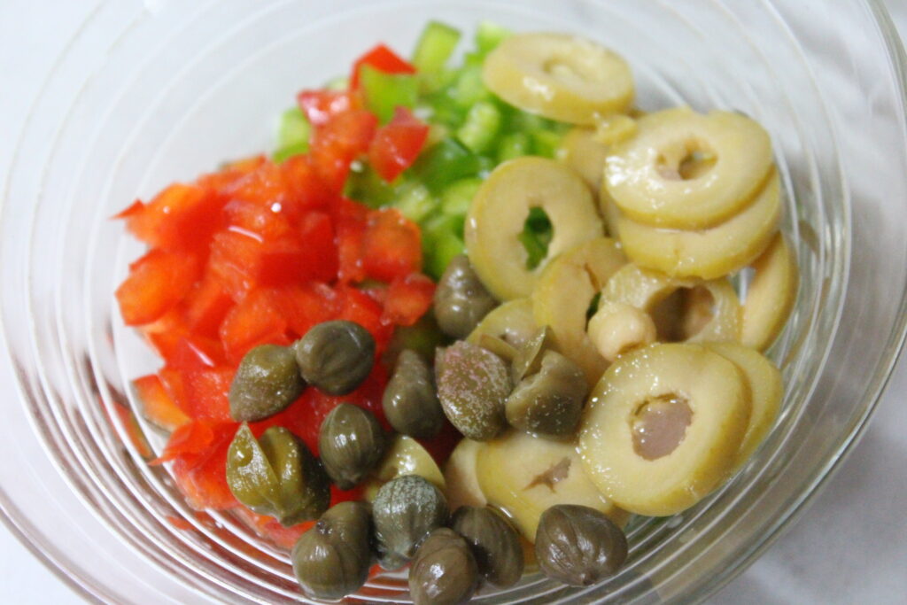 Cortar en brunoise los pimientos. En rodajas las aceitunas rellenas de anchoa y las alcaparras las dejas como están. Mezclar con algo de AOVE y el vinagre. Reservar.