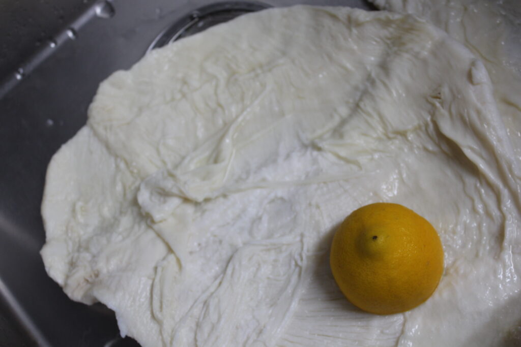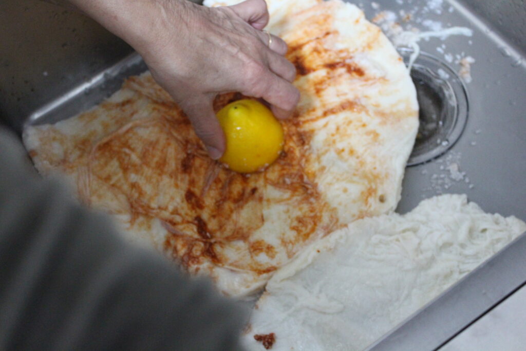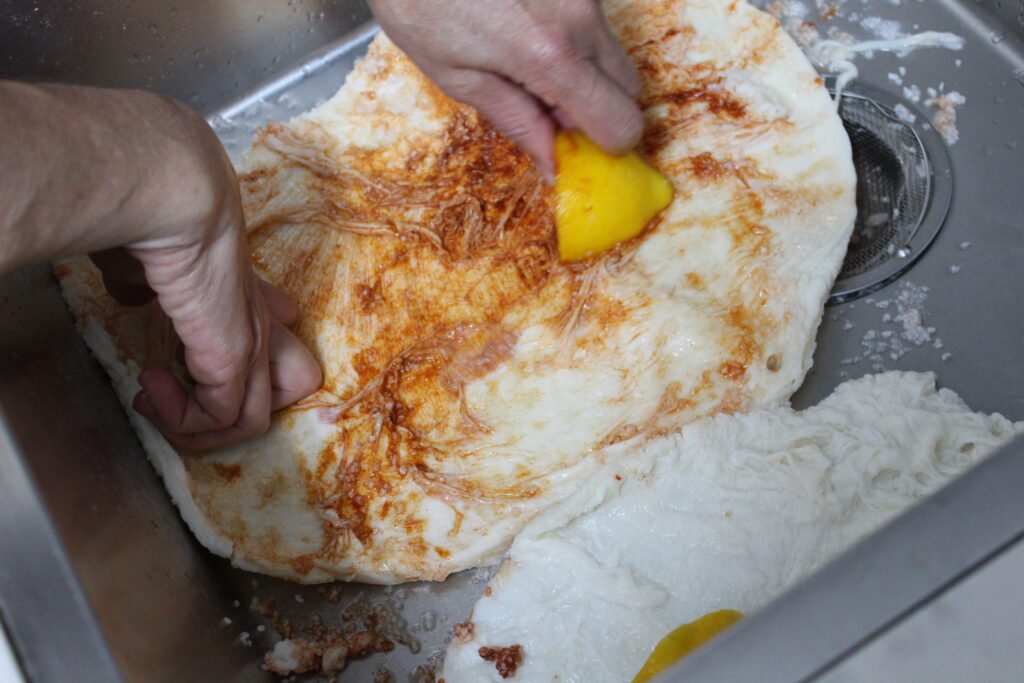 Con la ayuda de 4 medios limones, sal gorda y pimentón dulce, limpiar los trozos de callos (antes de cortarlos), como si de ropa se tratara. Frotando con los medios limones, la sal gorda y el pimentón, aclarando y volviendo a frotar por ambas partes (mejor hacer esto en la fregadera). Así durante, por lo menos, 15 min. Aclarar con agua abundante y fría. Esto lo contaba José Castillo en sus libros de cocina y no he encontrado mejor manera de hacerlo.