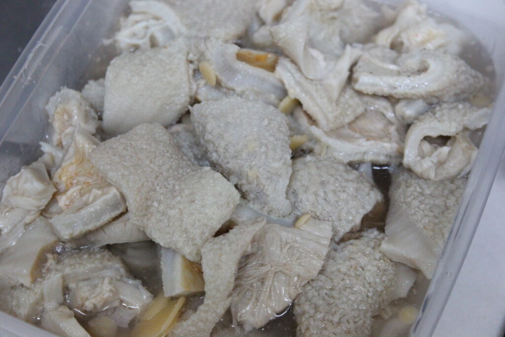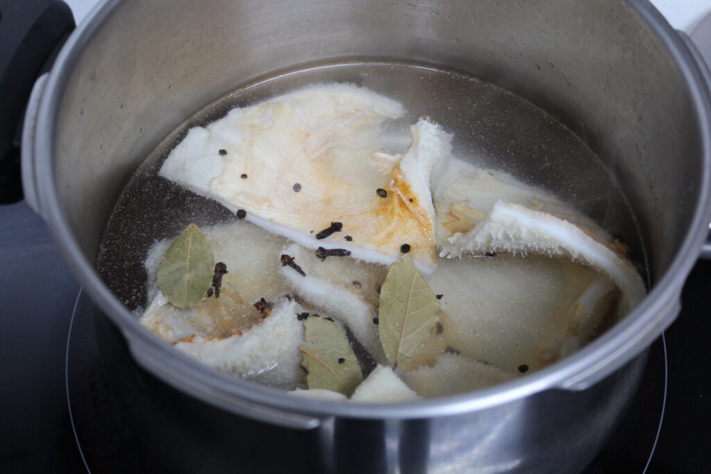 Preparar una olla con agua hirviendo e introducir los callos     limpios y cortados en trozos. Dejar