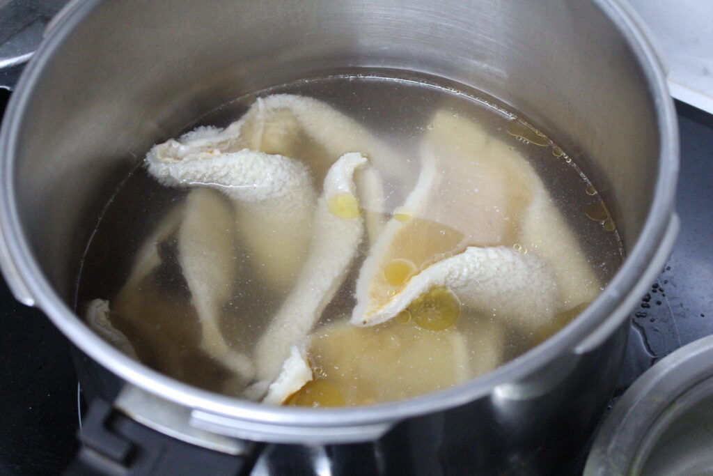 Desechar esa agua y reemplazarla por otra limpia. Cuando hierva de nuevo, reintroducir los callos y dejarlos que hiervan otros 2 min. Volver a sacarlos nuevamente con la espumadera y desechar de nuevo el agua.