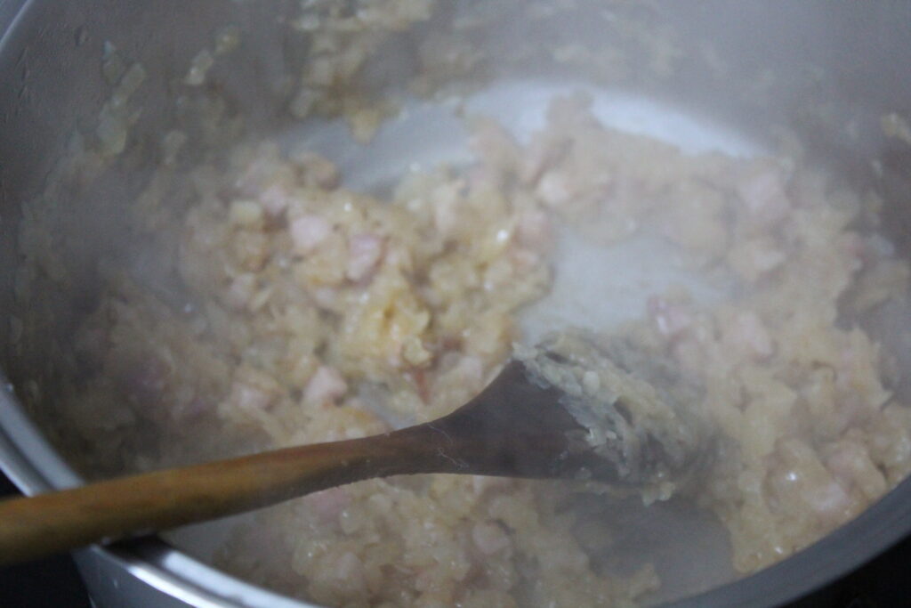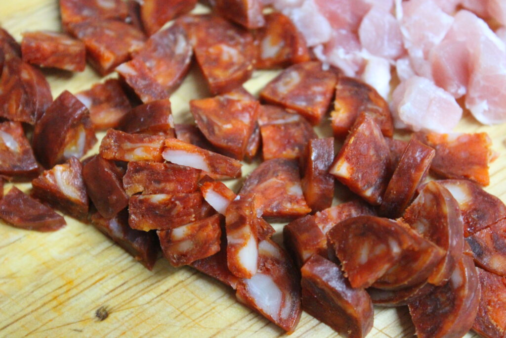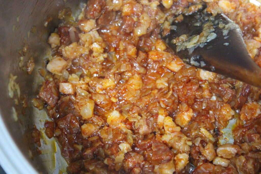 En una cazuela meter la cebolla, el puerro, el pimiento verde y el ajo muy picado y sofreírlo con un poco de aceite. Cuando las verduras tomen color, echar el jamón y el chorizo en daditos. A continuación, el vino blanco. Dejar hervir 5 min a fuego suave. Agregar el clavo, la cayena y el laurel; por último, la salsa de tomate.
