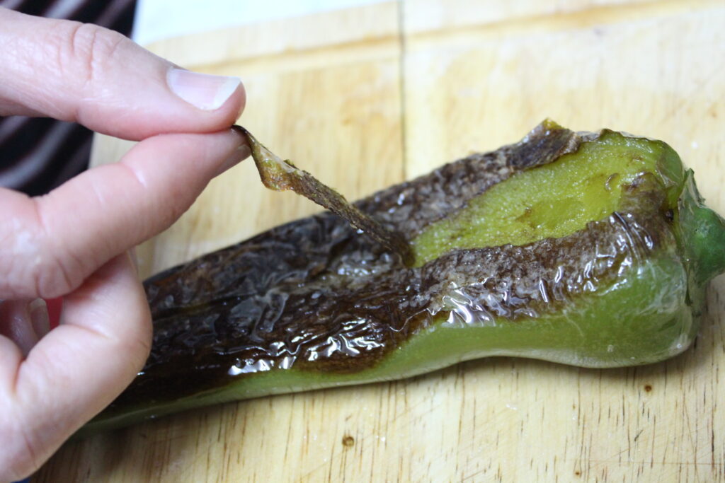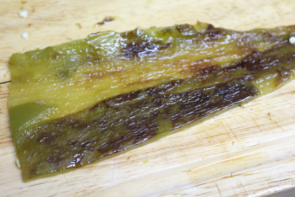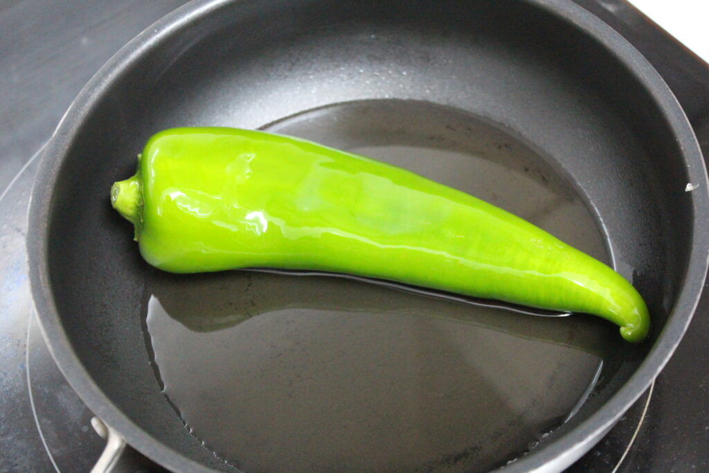 Freír el pimento verde en aceite de oliva a fuego suave. Cuando este dorado por fuera y todavía caliente, retirar la piel y pasarla por la plancha con sal y azúcar. Reservar.