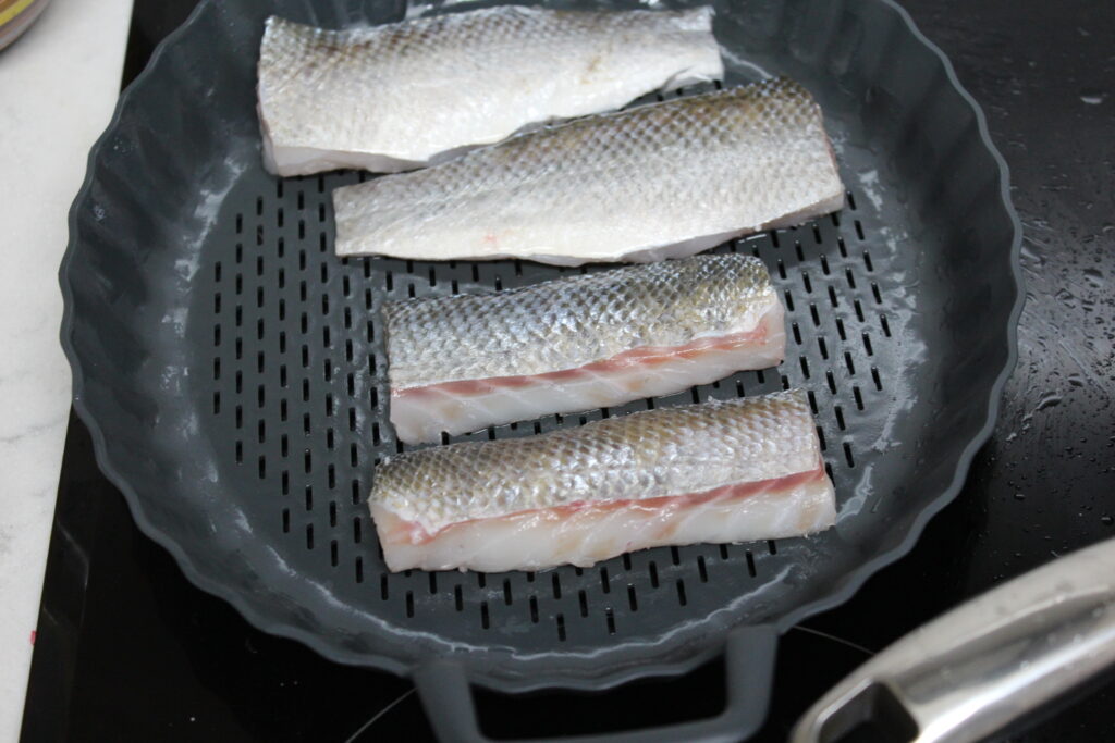 Limpiar la lubina y hacer dos lomos que irán cocinados al vapor. La ventresca dividida en dos partes ira frita. Reservar.