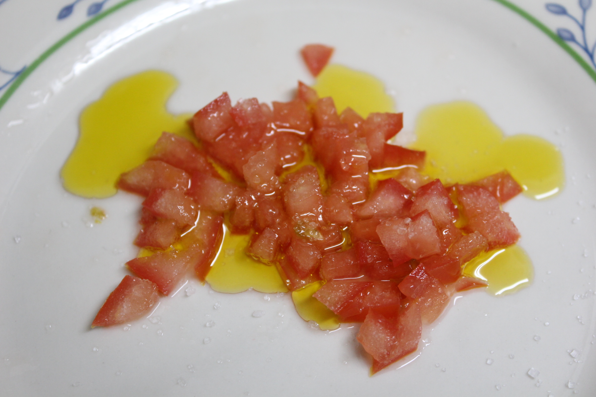 Cortar daditos del tomate y mantenerlo con sal y azúcar en el AOVE. Reservar