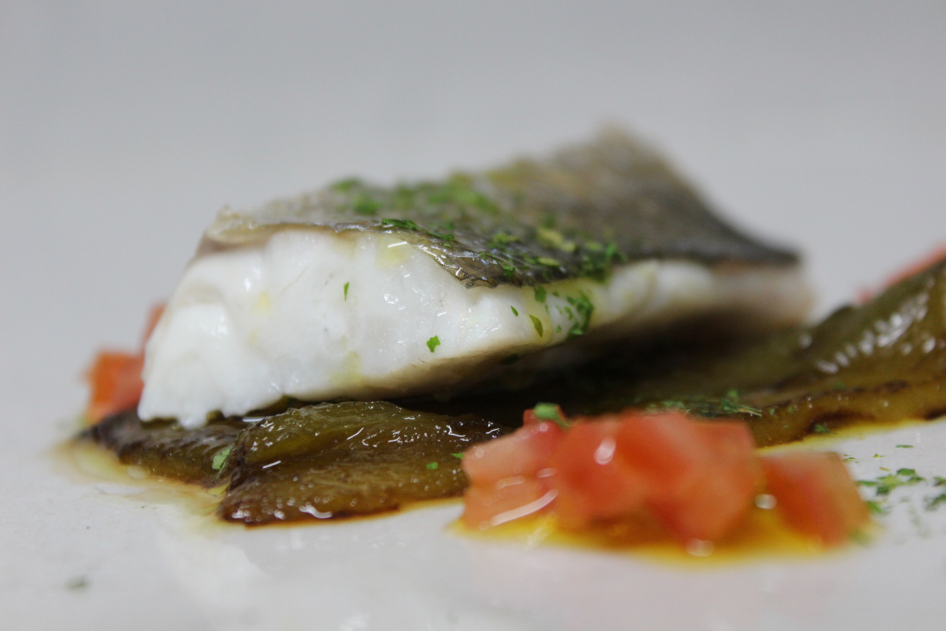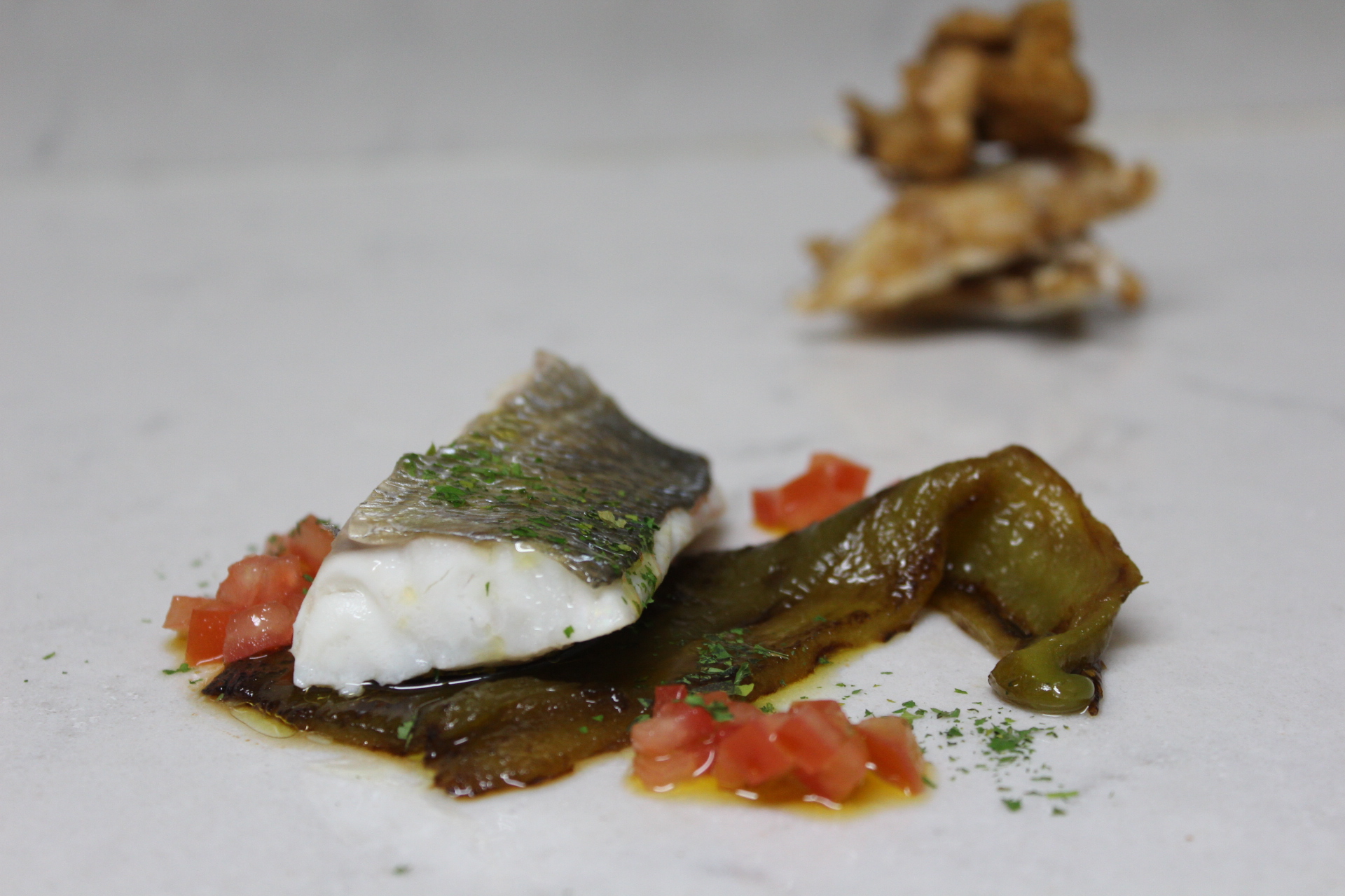 Pues eso presentaremos todo calentito. Sobre el pimiento los lomos de lubina con algo de la mezcla de tomate. A un lado la ventresca fritita.