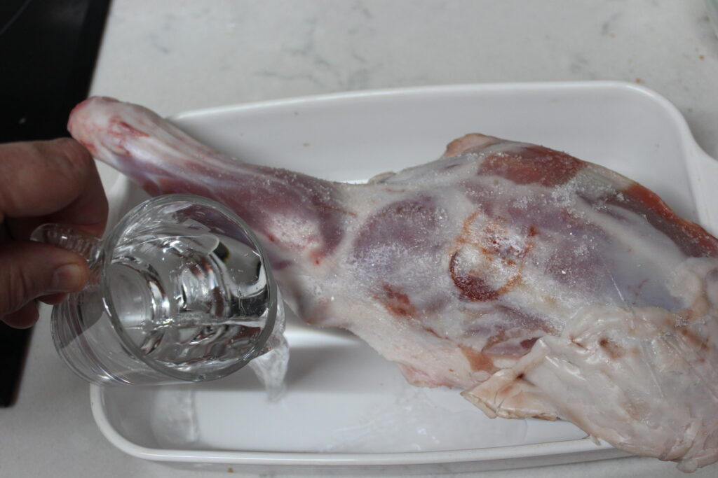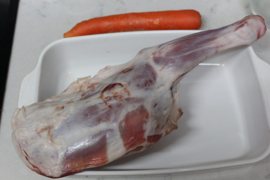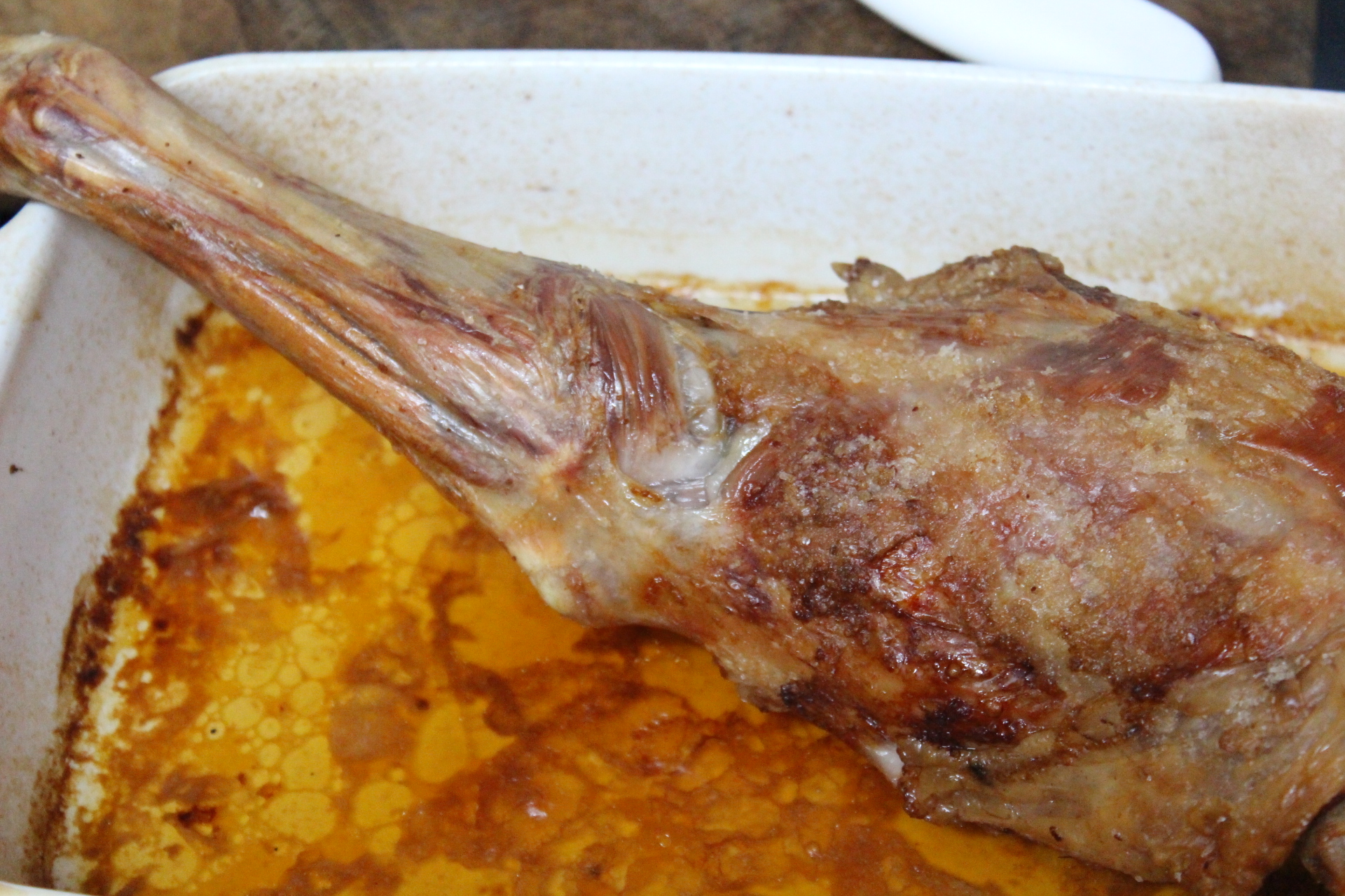 Disponer la paletilla previamente salada, en una rabanera de tal manera que quede apoyada en los bordes del recipiente. Verteremos en el fondo el agua. No más historias. Horno a 180ºC durante aprox….50 min. Horno a 240ºc durante 10 minutos más para que nos dore la superficie. El jugo que se forma abajo lo puedes soltar con un poco de agua en caso de que se te haya oscurecido un poco.