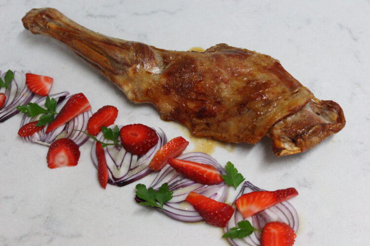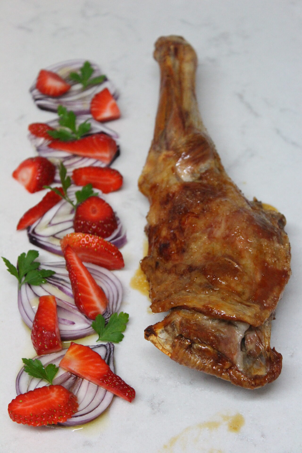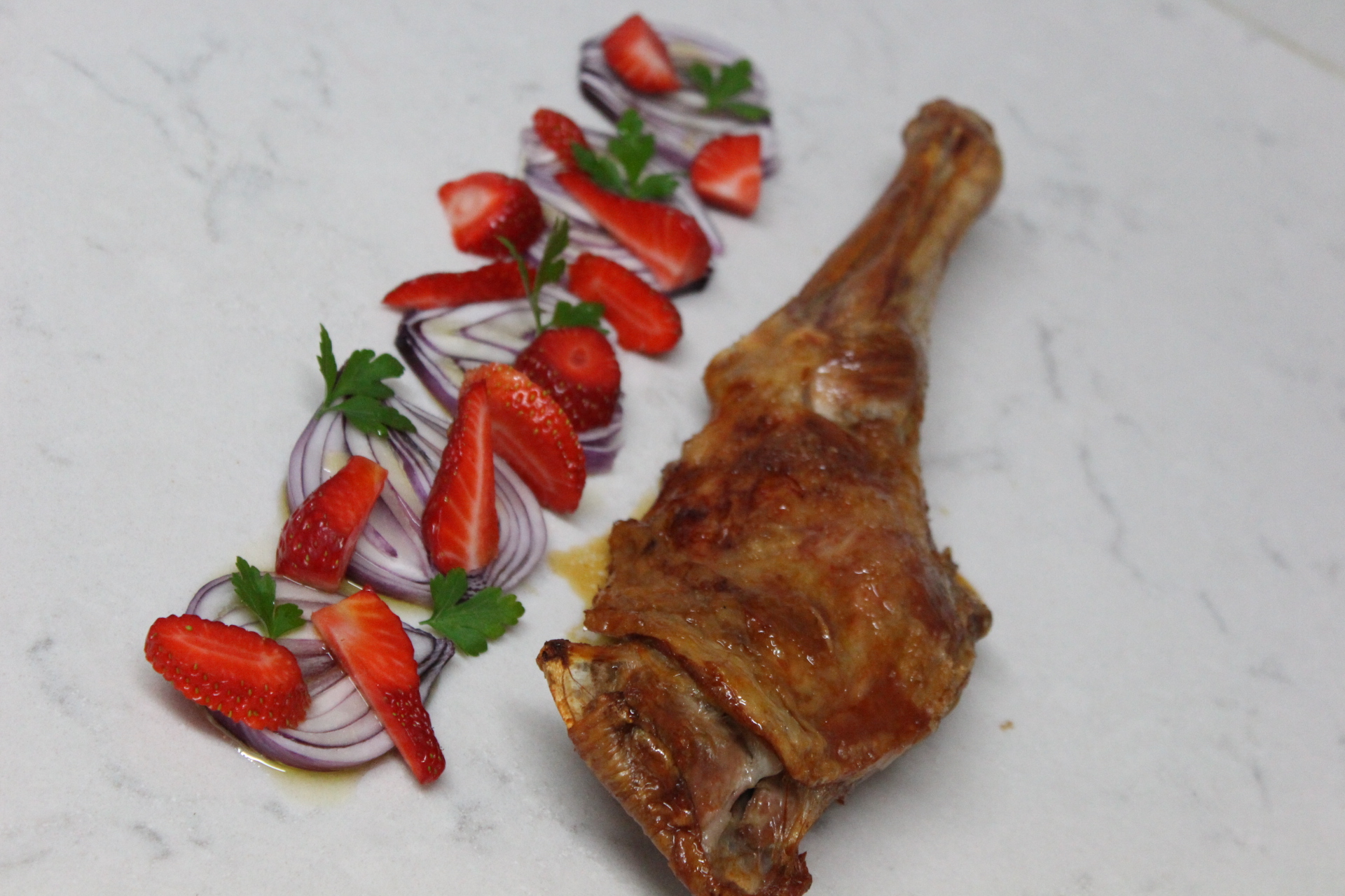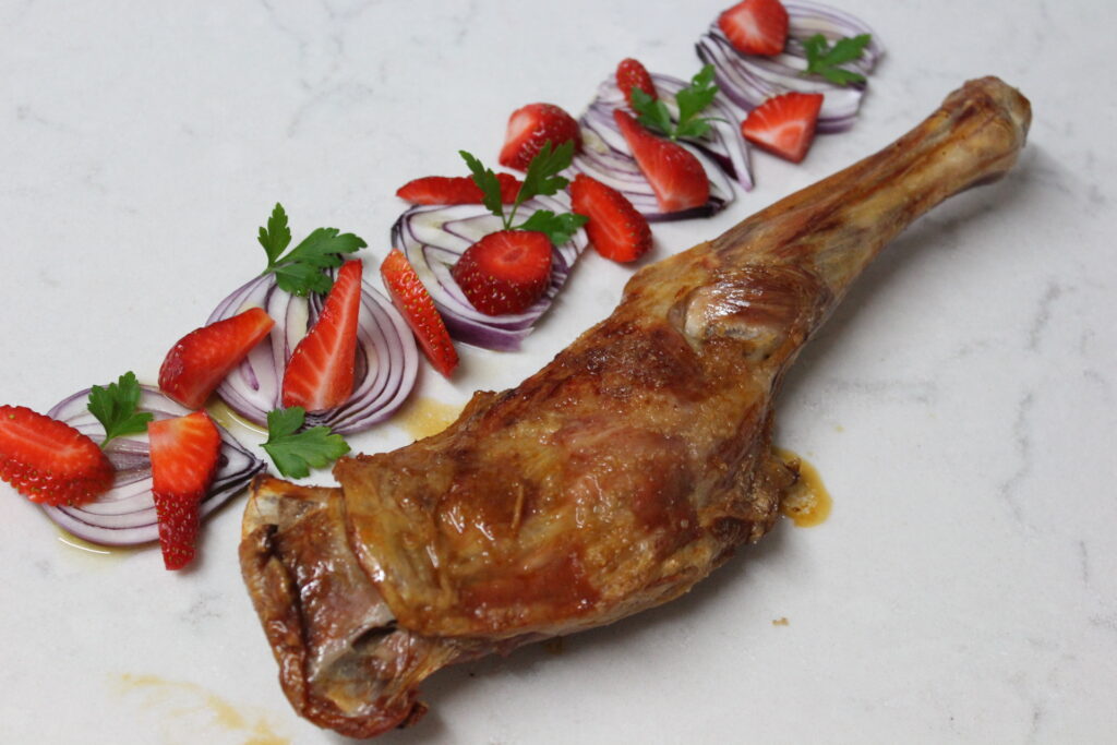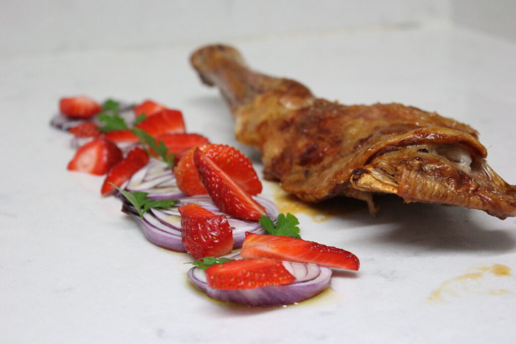 La paletilla bien caliente acompañado de la ensalada de fresas y cebolla con la vinagreta….más no se puede pedir.