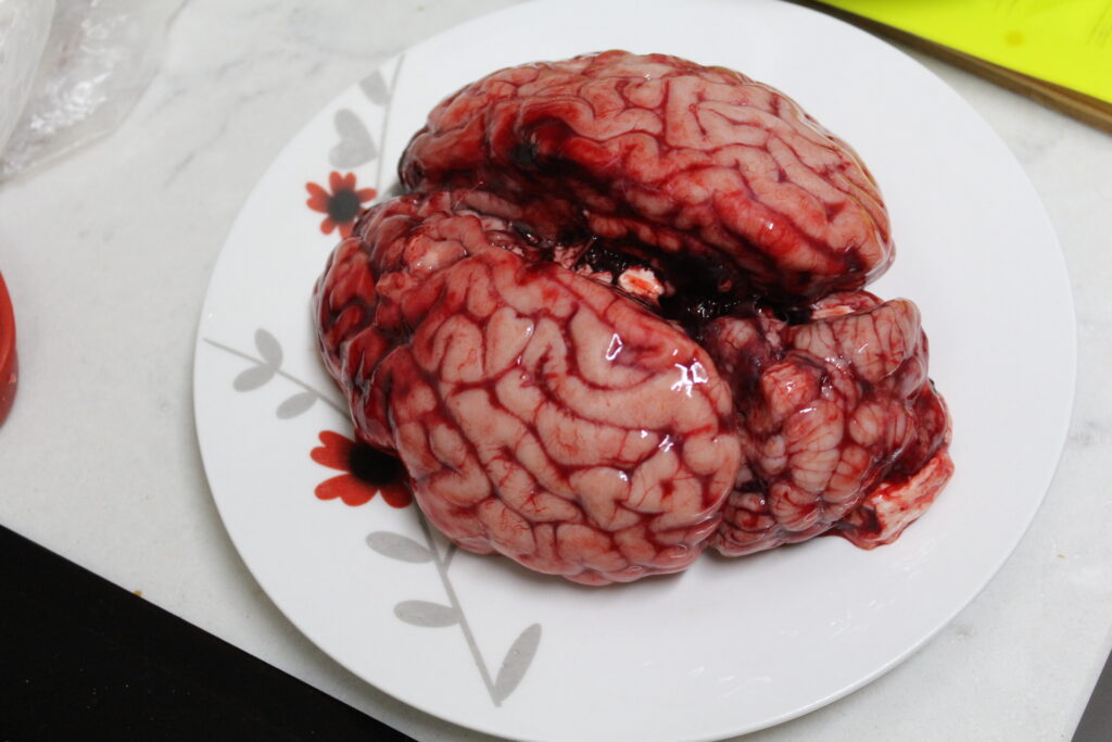 Limpiar bien el seso con agua muy fría y vinagre durante por lo menos dos horas. Desechar el agua. Cocerlo durante 15 min en agua salada y dejar enfriar. Reservar.
