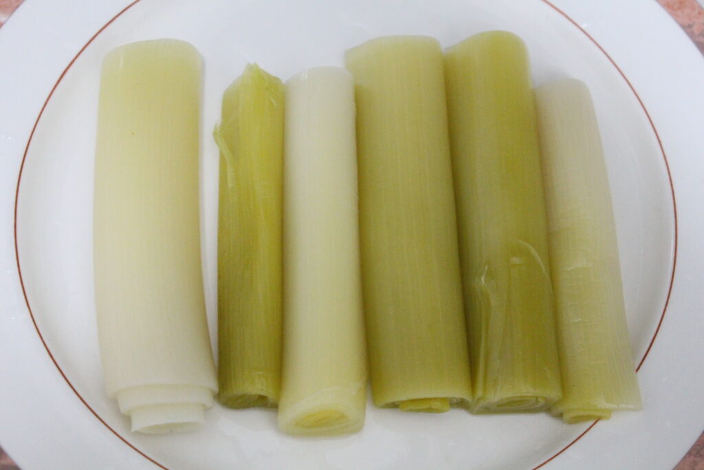 Limpiar a fondo los puerros y ponerlos a cocer durante 20 min en agua con sal. Reservar.