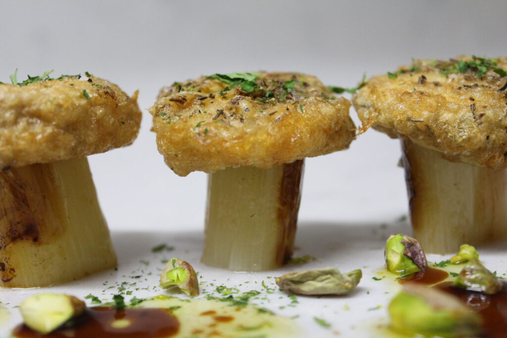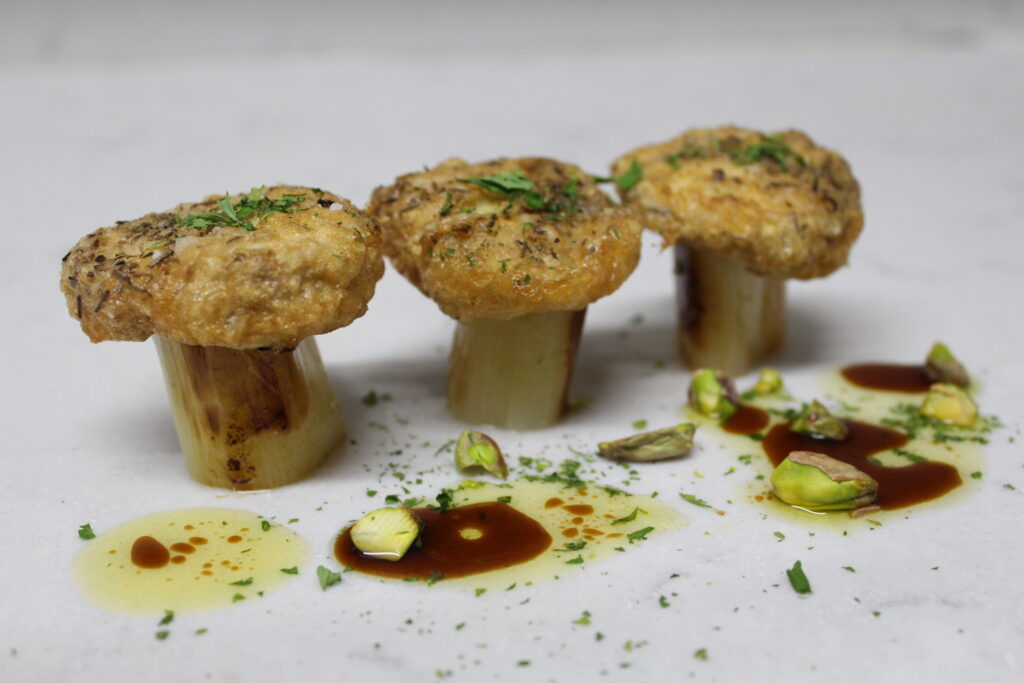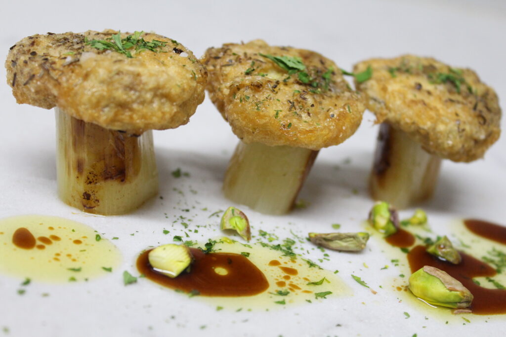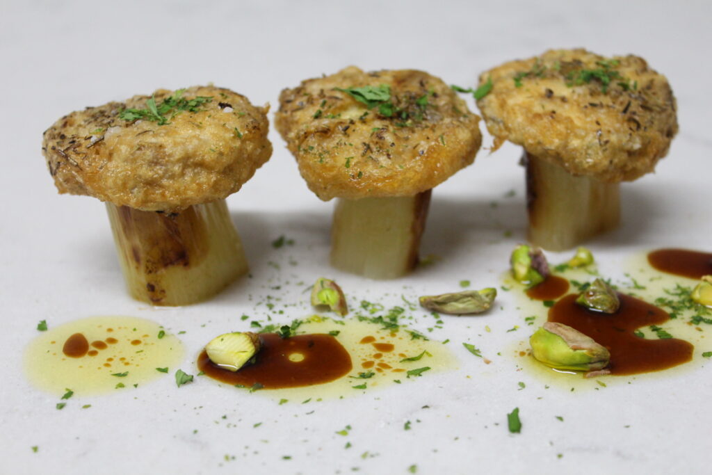 Planchar en una sartén los puerros. Cortarlos en trozos de tres centímetros. Servirán de base a trozos circulares de sesos que hemos rebozado en harina y huevo batido mezclado con las hierbas aromáticas y frito hasta dorar.