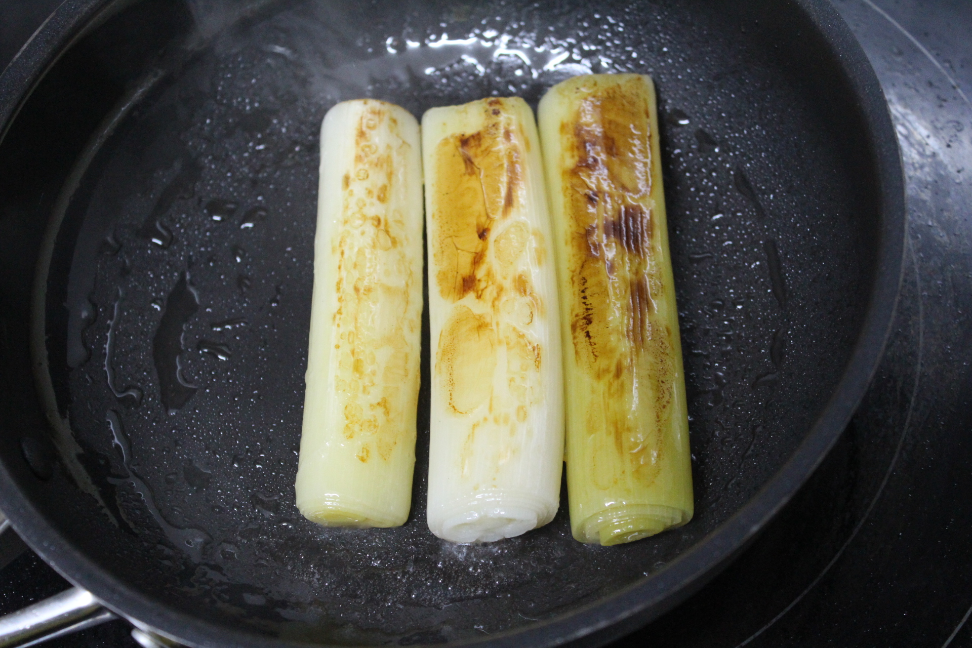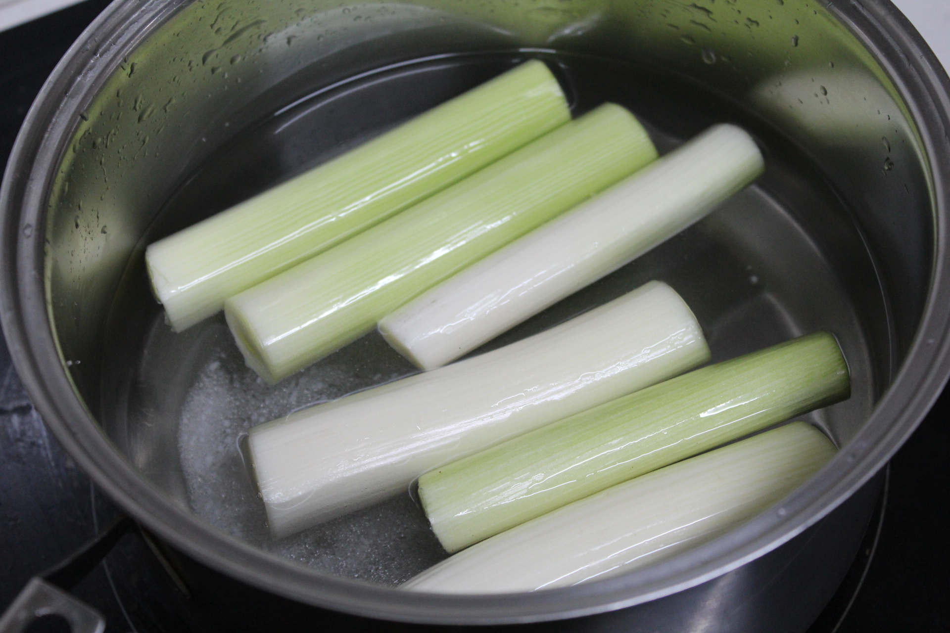 Limpiar a fondo los puerros y ponerlos a cocer durante 20 min en agua con sal. Reservar.