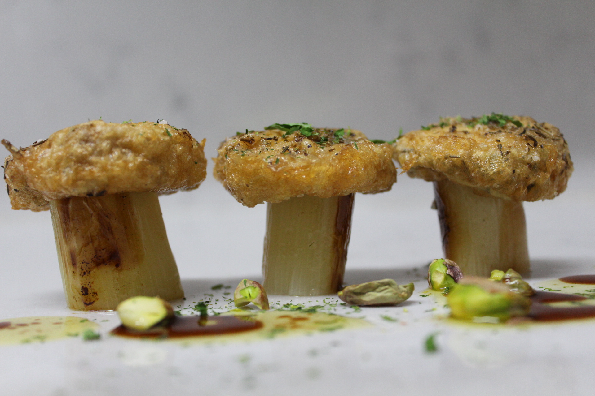 Planchar en una sartén los puerros. Cortarlos en trozos de tres centímetros. Servirán de base a trozos circulares de sesos que hemos rebozado en harina y huevo batido mezclado con las hierbas aromáticas y frito hasta dorar.