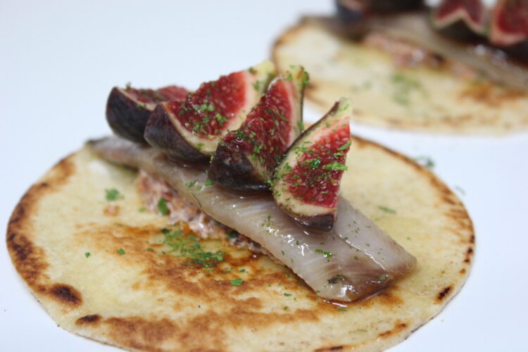Disponer sobre cada tortilla un poco de la mezcla del tomate. Encima una sardina, alcaparras y para rematar gajos de higo recién cortado. Ideal y fácil. Como siempre.