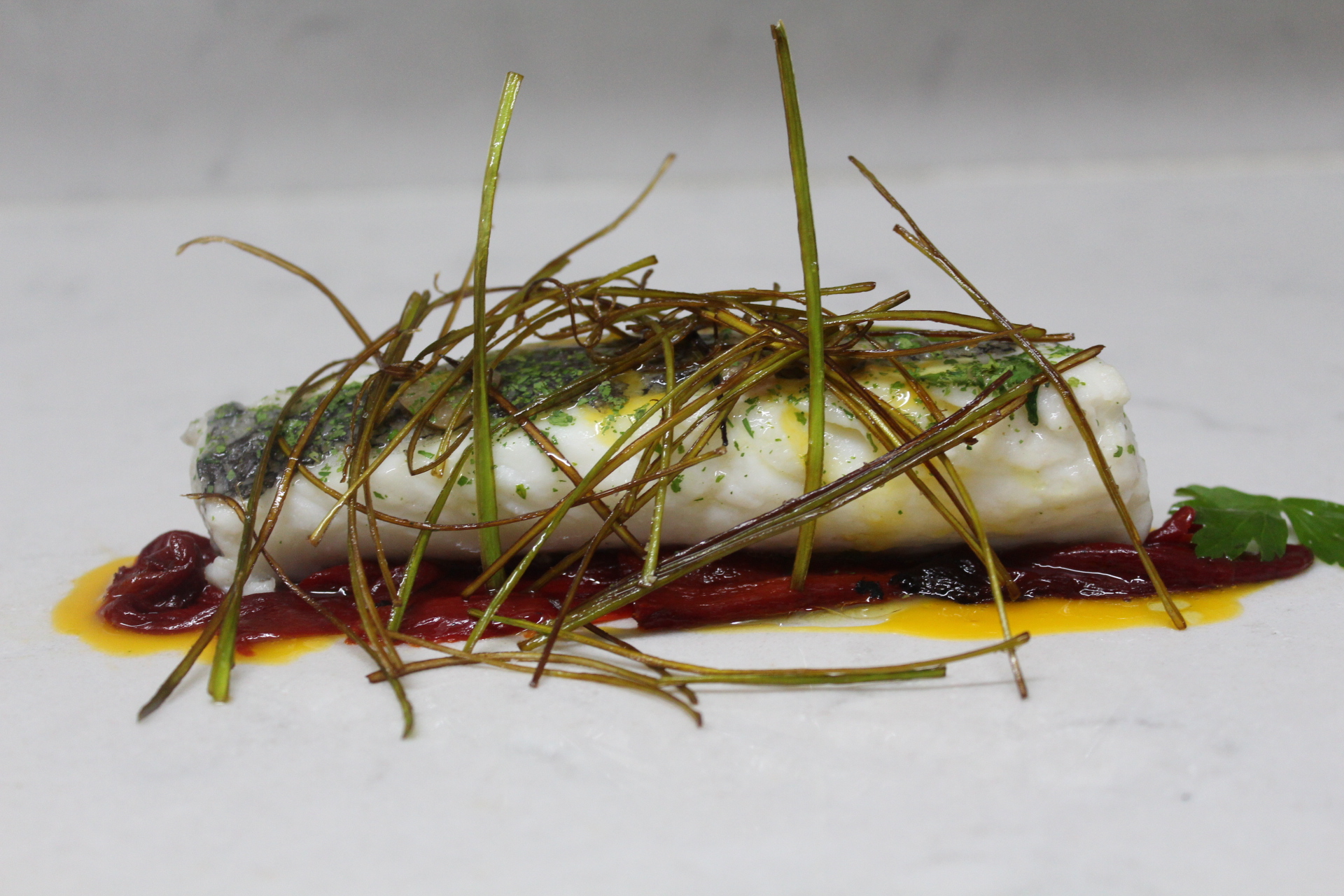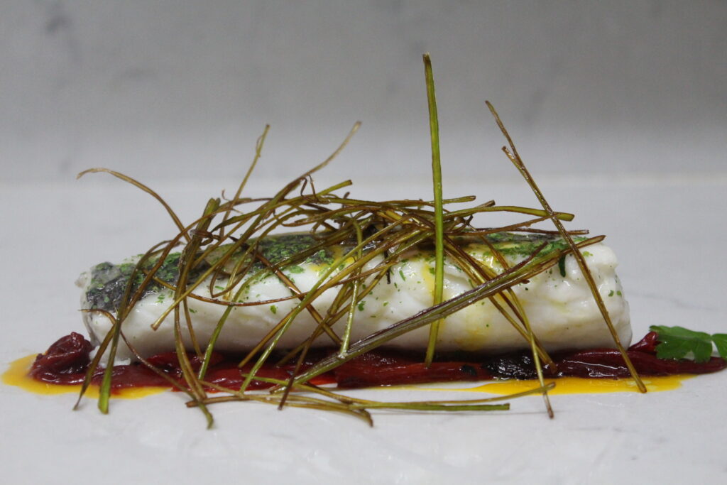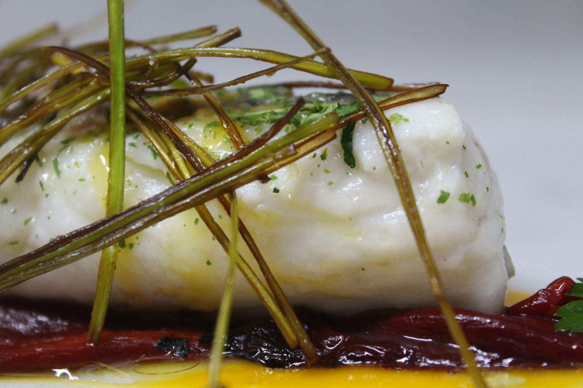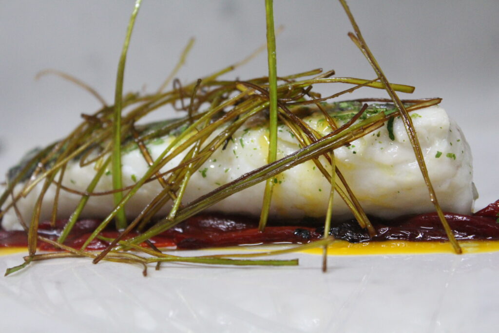 La presentación es sencilla pero resultona. Base de piquillos asados, apenas dos por lomo, un poco de yema y algo de AOVE. Encima la merluza y por último los puerros.