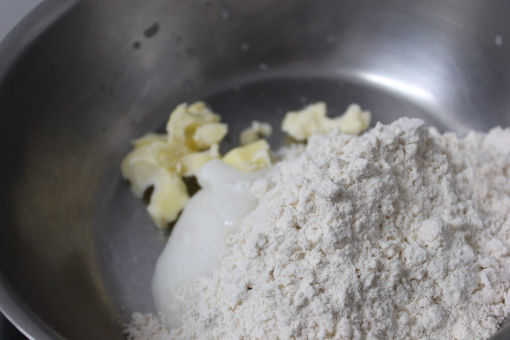 La harina con la manteca y la mantequilla.