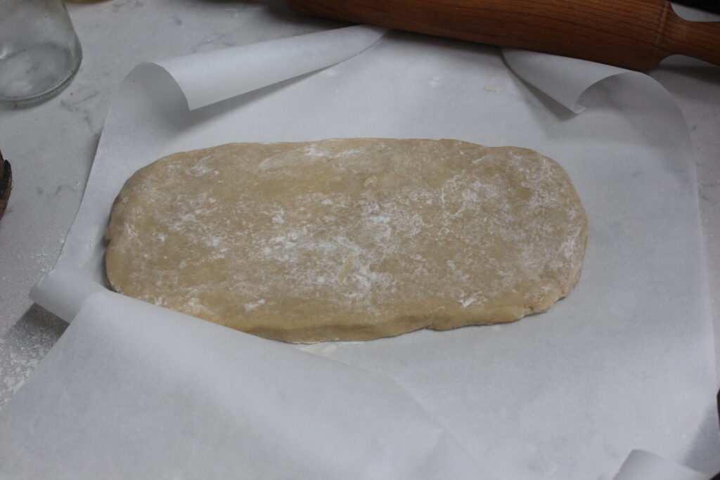 Mezclar la mantequilla pomada y la manteca de cerdo en la misma consistencia con la harina. Poco a poco verter el vino blanco hasta obtener una masa espesa. Dejar reposar en frio por lo menos tres horas.