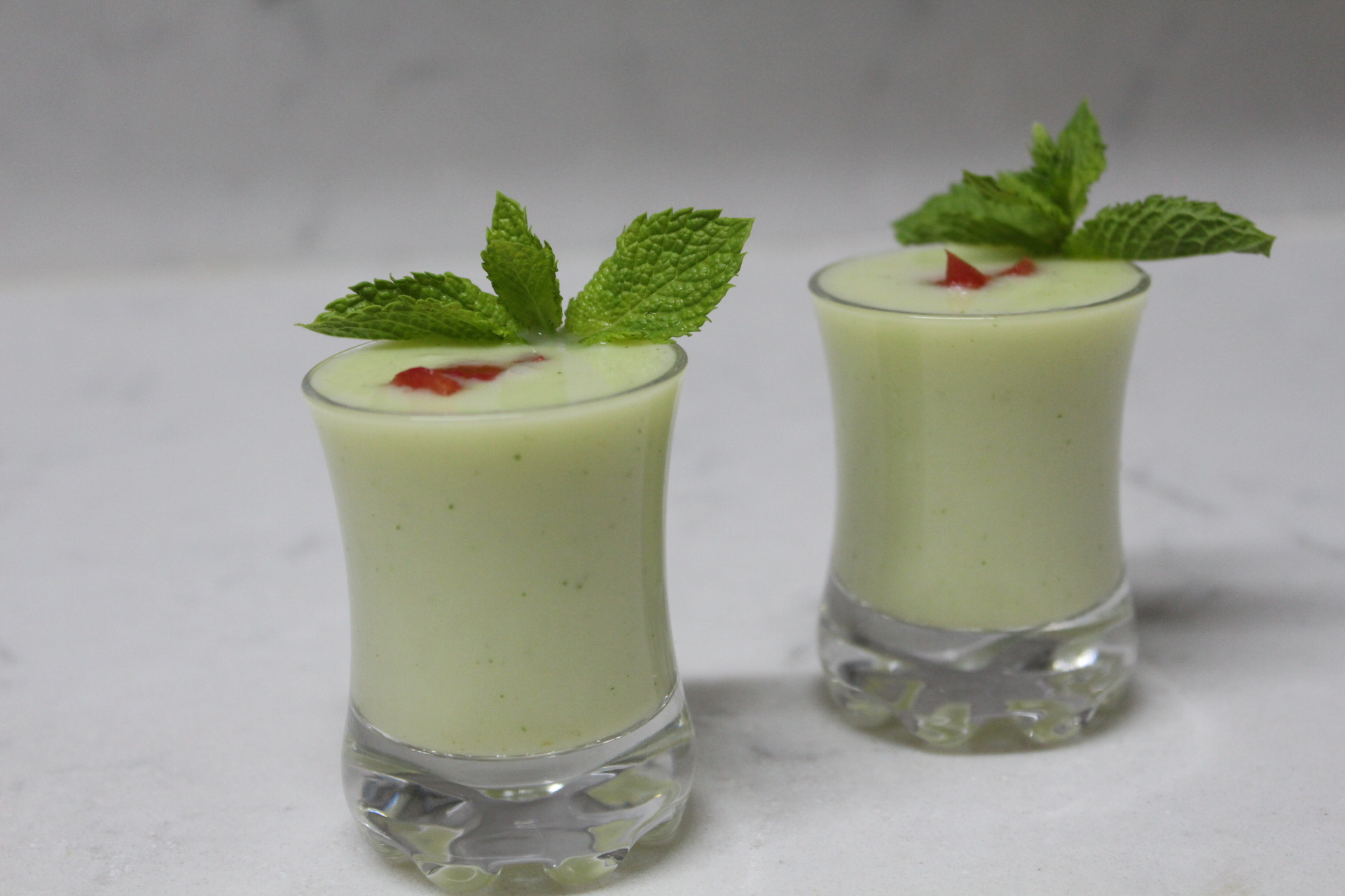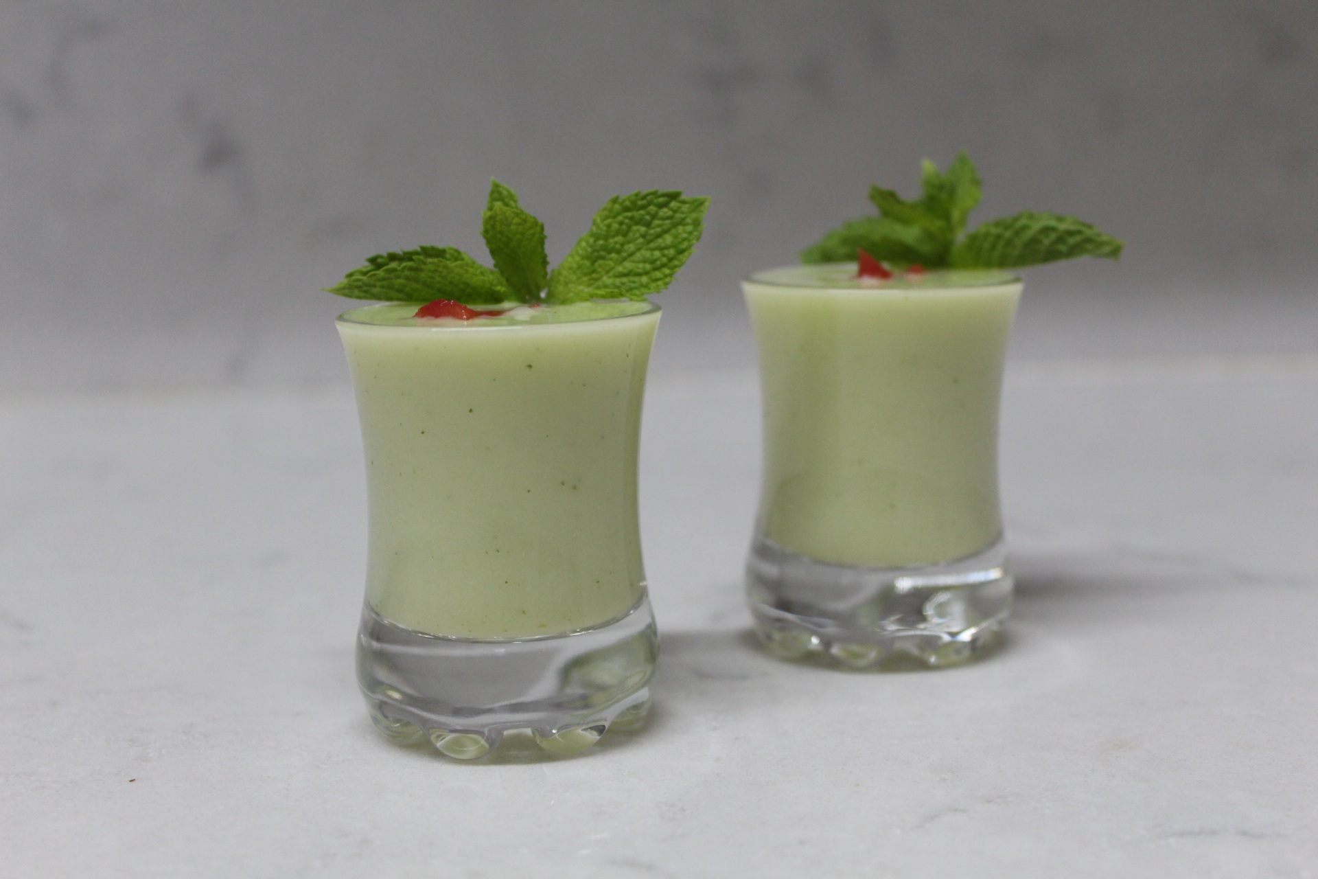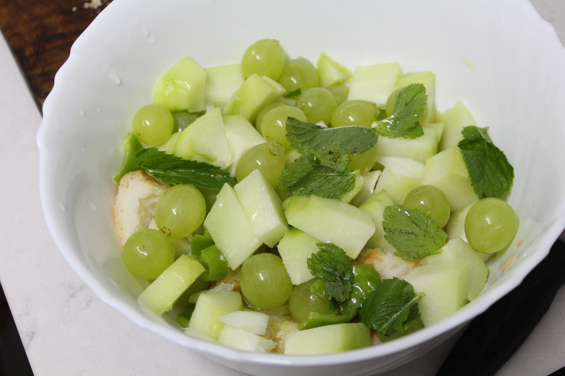 Disponer todo en un bol y triturar a fondo. Colar a conciencia. Dar punto de sal y de vinagre. Enfriar por lo menos 6 horas. Servir con una ramita de menta y trocitos de tomate….Sencillo y resultón.