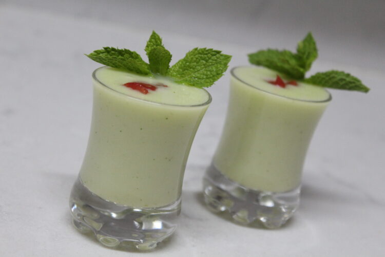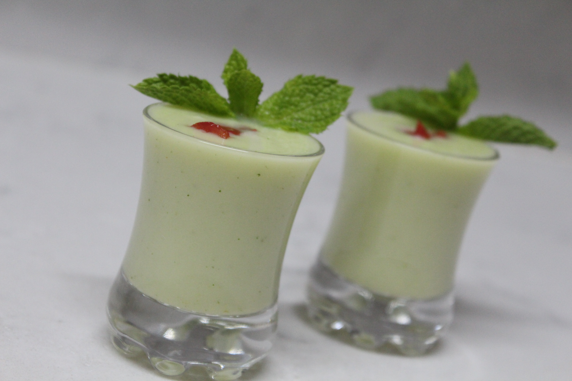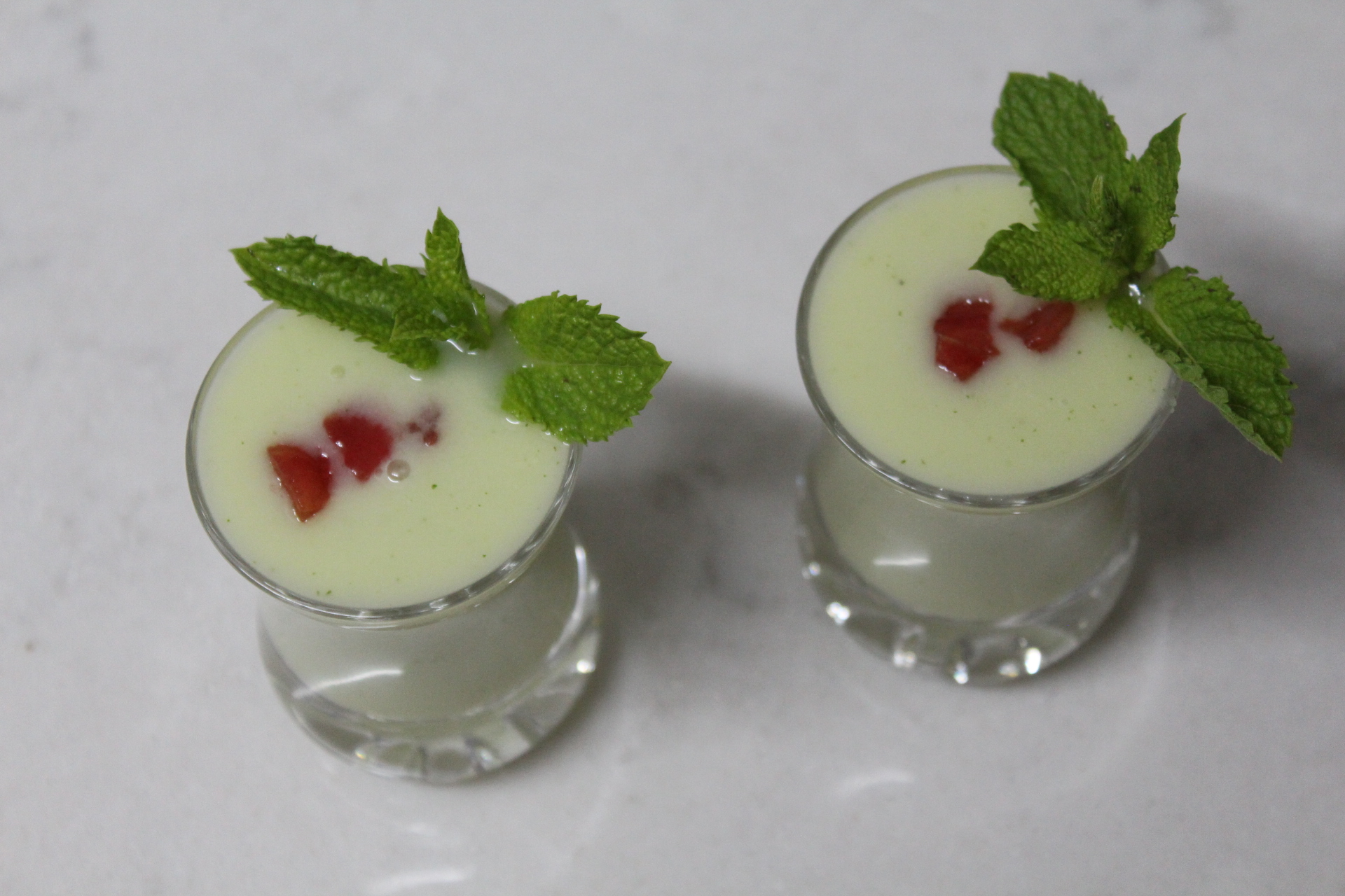 Disponer todo en un bol y triturar a fondo. Colar a conciencia. Dar punto de sal y de vinagre. Enfriar por lo menos 6 horas. Servir con una ramita de menta y trocitos de tomate….Sencillo y resultón.