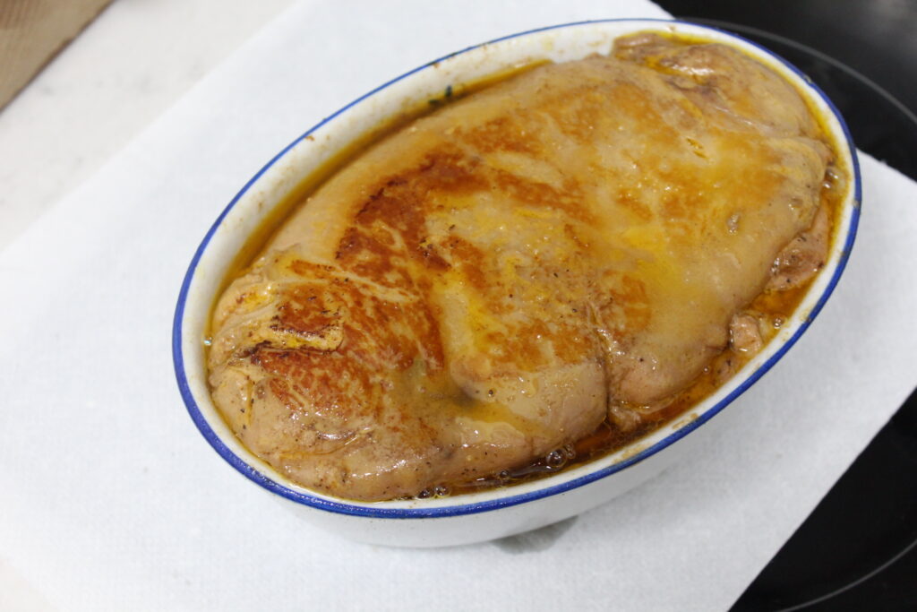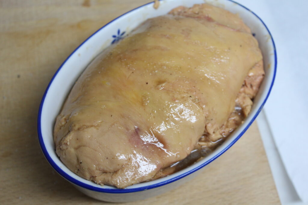 Con la punta de un cuchillo desvenar el hígado a lo largo de los dos lóbulos. Sazonar generosamente. Empapar con el licor que hayamos elegido. Planchar en una sartén muy caliente durante medio minuto para que una superficie quede tostada. Después, cocinar en una terrina de cerámica en el horno a una temperatura muy concreta: 70ºc durante 50 minutos.