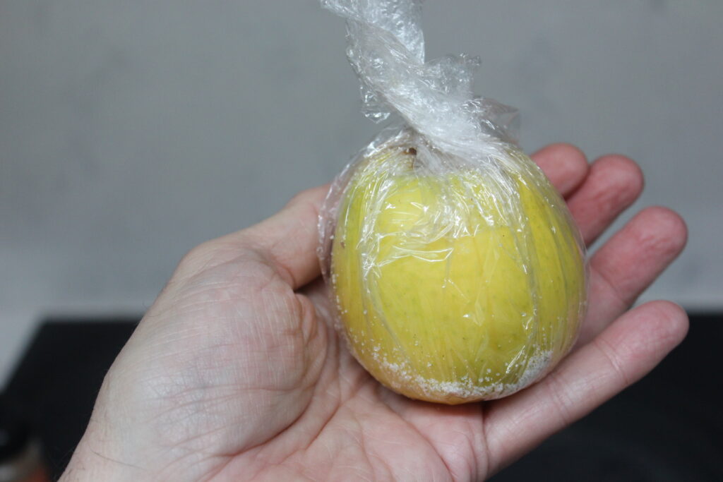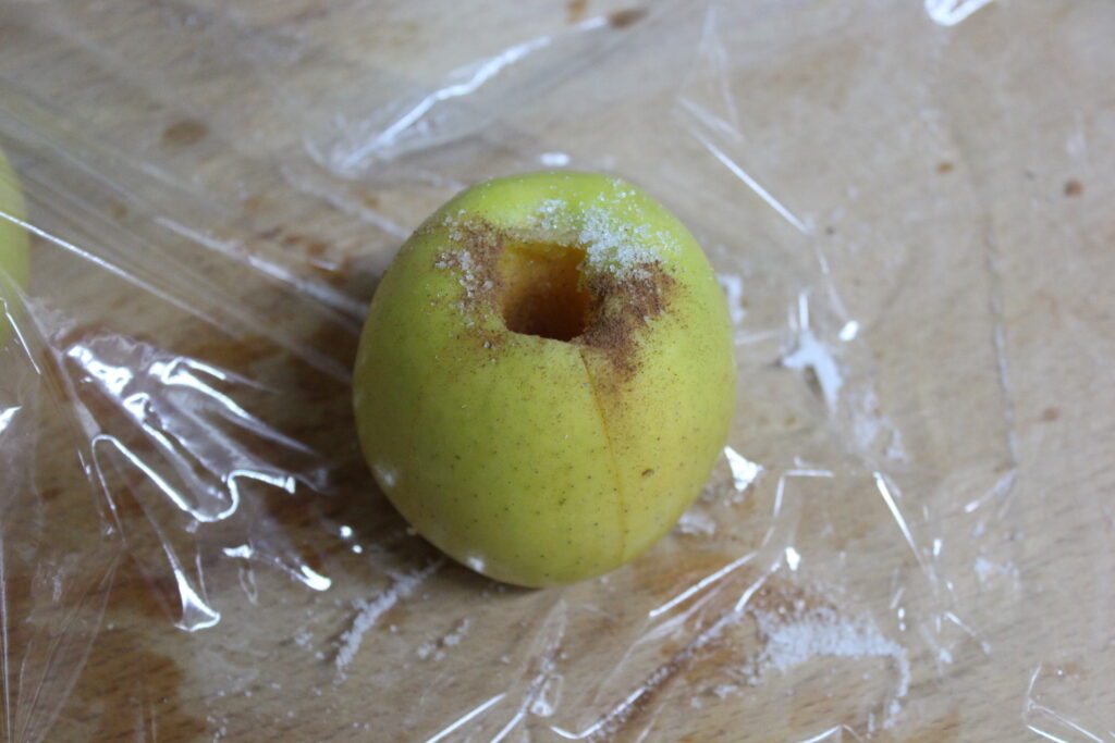 Envolver en filme una manzana descorazonada con un poco de azúcar y canela en su interior. Cocinar dos minutos en el microondas. Dejar enfriar durante por lo menos dos horas