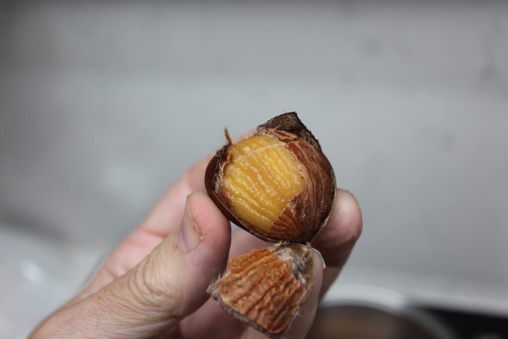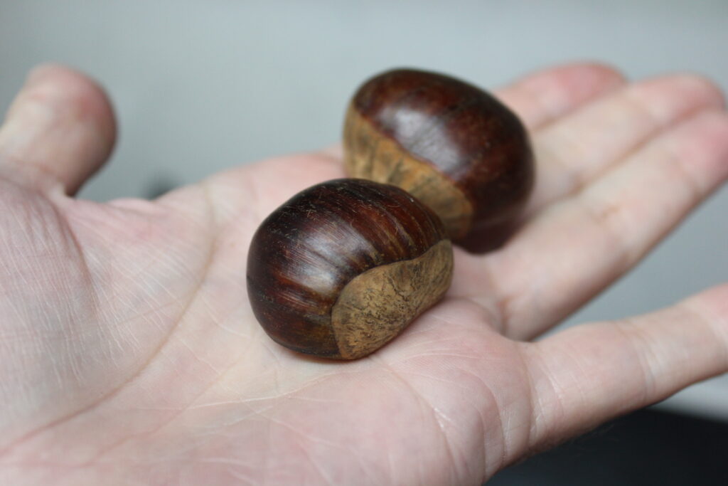 Castaña. Con ayuda de un cuchillo afilado y mucho cuidado que la cascara es dura,